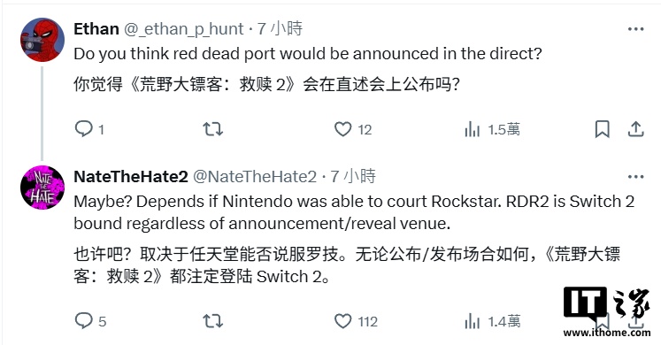 值得注意的是,后续这名消息人士在解答玩家疑惑时表示,如果任天堂能争取到 Rockstar 的话,那么直面会上就会有《荒野大镖客:救赎 2》游戏的最新消息,但无论直面会是否公布这款游戏的消息,《荒野大镖客:救赎 2》最终都会上 Switch 2。