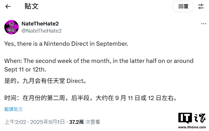 IT之家 9 月 1 日消息,消息人士 NateTheHate2 今天在 X 平台透露,任天堂将在本月举行直面会。