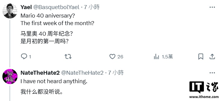 后续许多玩家都在评论区期待任天堂会在直面会上公布《超级马力欧兄弟》40 周年纪念作和《密特罗德究极 4 穿越未知》游戏的最新消息,但 NateTheHate2 表示,他并没有听说到任何关于《超级马力欧兄弟》40 周年纪念作的消息。